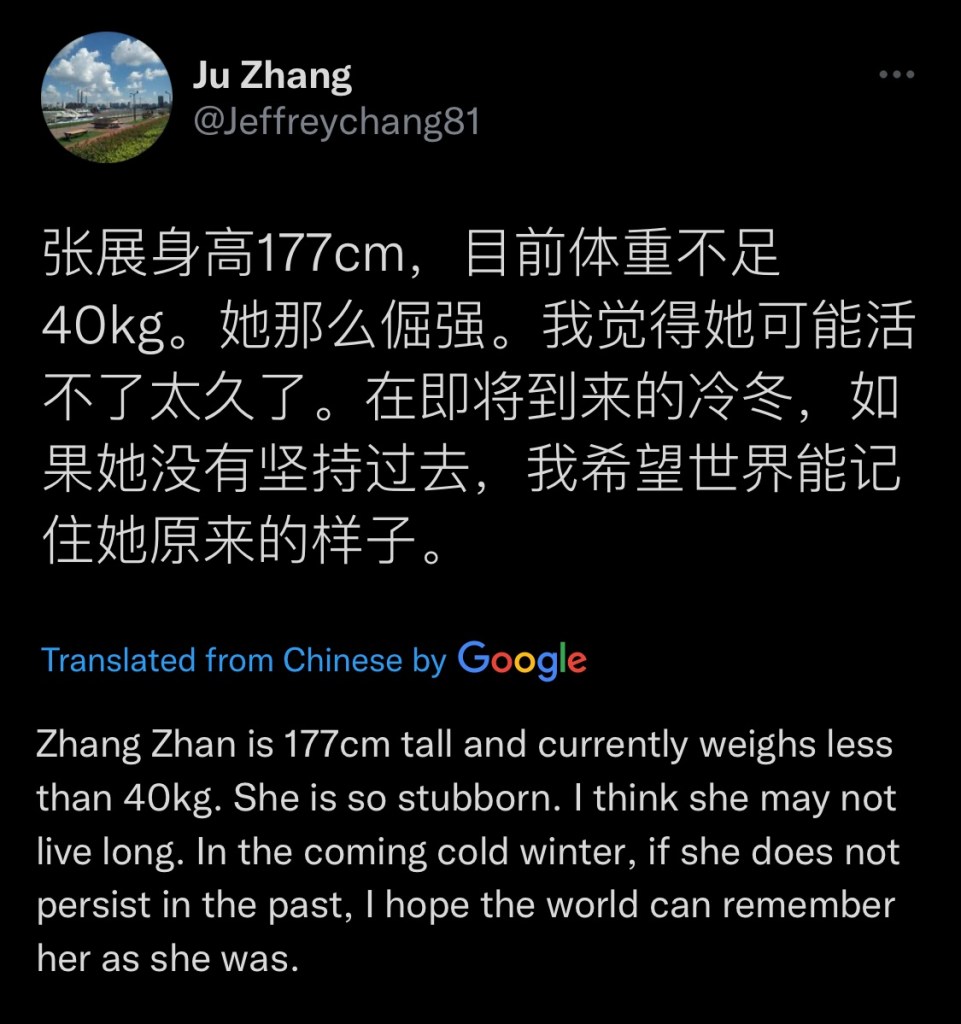 “She is so stubborn. I think she may not live long.” Zhan’s brother, Zhang Ju wrote on October 30th, 2021. Zhang Ju stated, at 5’ 9” she weighed only 88lbs. “She may not survive the coming cold winter. I hope the world remember[s] how she used to be.”