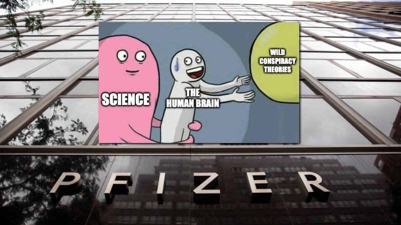 Big Pharma company Pfizer unleashed a strange meme on social media, in an attempt to connect with the Internet populous. The meme displays an odd pink monster, deemed “Science”, wrapping its arms around a nervous figure, “the human brain”, as the figure reaches for a yellow bubble, which reads “wild conspiracy theories”.