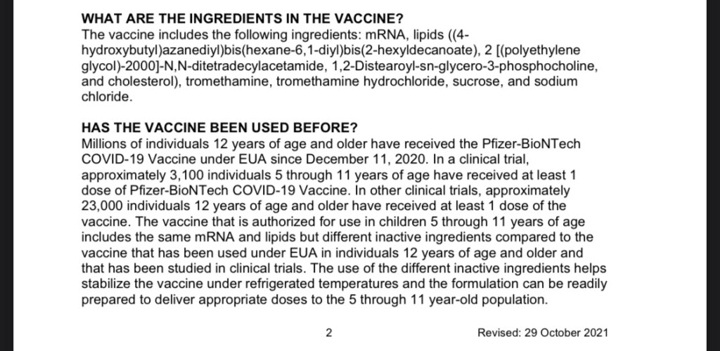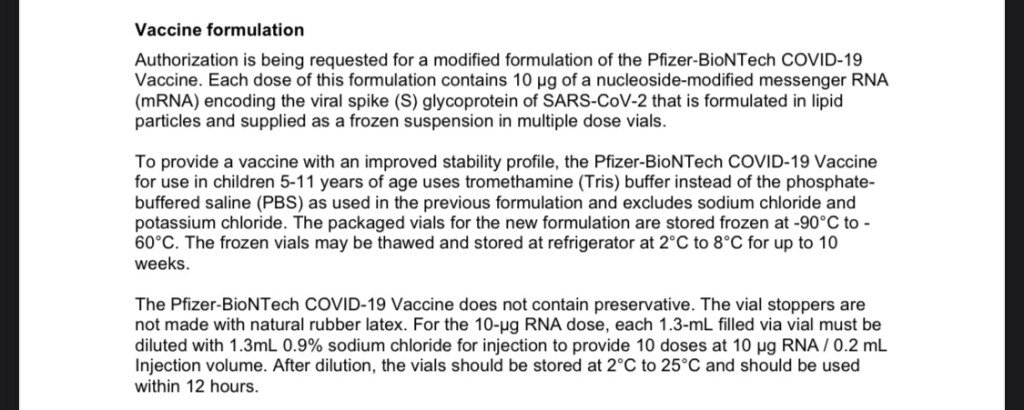 Taking a closer look at the ingredients of the Comirnaty coronavirus vaccine now injected into children, the pharmaceutical companies Pfizer-BioNTech have altered the vaccine ingredients, for greater efficacy in children aged 5 – 11.