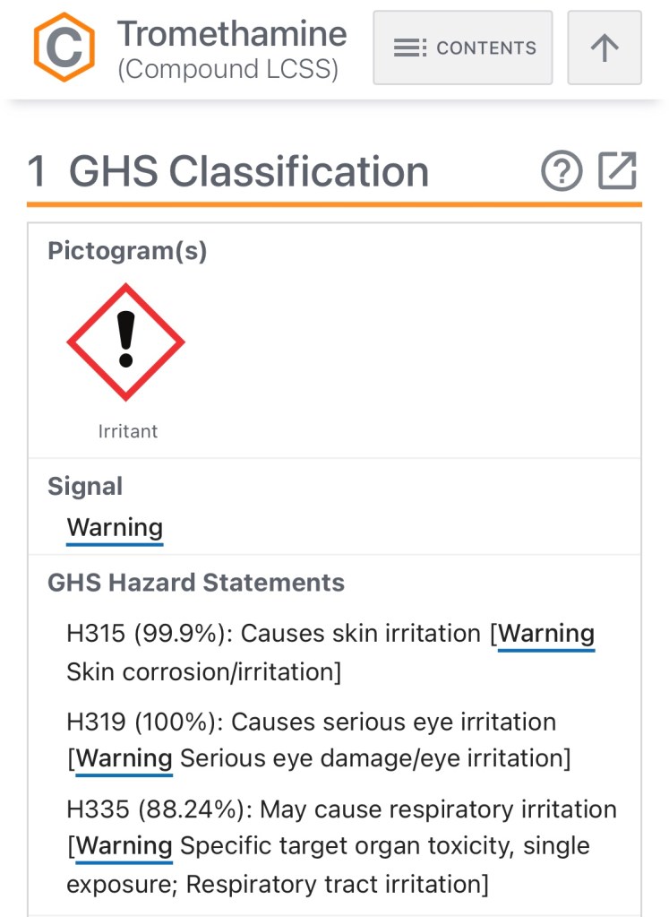 - https://pubchem.ncbi.nlm.nih.gov/compound/Tromethamine#section=Safety-and-Hazards