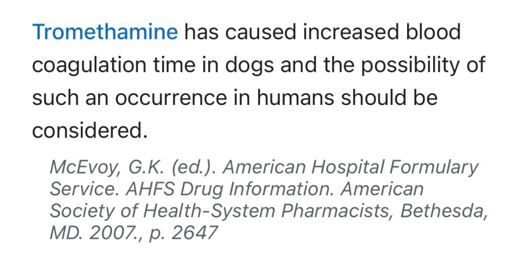 In addition, Tromethamine is known to cause increased blood coagulation time in dogs. As stated by the Nation Institutes of Health, “the possibility of such an occurrence in humans should be considered”.