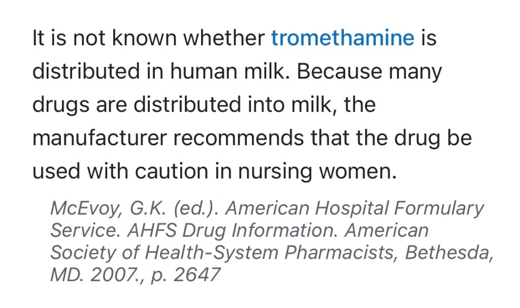 Tromethamine is still an under researched chemical substance. it is not known whether tromethamine is distributed in human milk. The National Institutes of Health states “Because many drugs are distributed into milk, the manufacturer recommends the drug be used with caution in nursing women.”