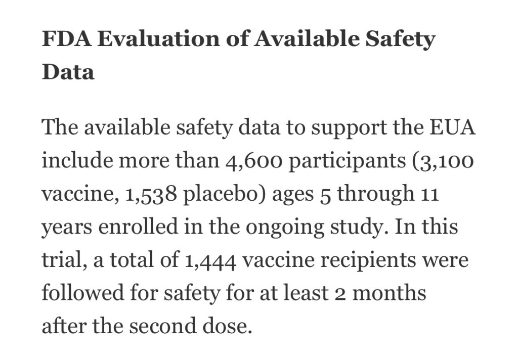 Pfizer’s safety data comes not only from their experimental trials which tested potential harmful vaccine effects on 2,268 “volunteered” children, but from more than 4,600 participants, monitored for safety at least two months after receiving the concoction.