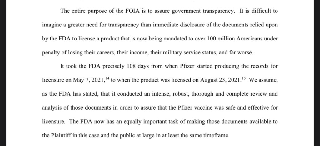 “The entire purpose of the Freedom of Information Act (FOIA) is to assure government transparency.” read a filing a complaint regarding the request to attain information from the major pharmaceutical company via the FOIA. It continued, “It is difficult to imagine a greater need for transparency than immediate disclosure of the documents relied upon by the FDA to license a product that is now being mandated in over 100 million Americans under penalty of losing their careers, their income, their military service status, and far worse.”