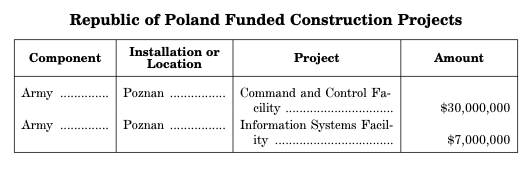 In addition, the bill authorizes military construction funded by the Republic of Korea (South Korea) and the Republic of Poland. This includes hundred of millions of dollars for military construction for South Korea’s Camp Humphreys, Camp Mujuk, Gimhae Air Base, and Osan Air Base. South Korea’s projects include a $149 Million Dollar Black Hat Intelligence Fusion Center, and a $171 Million Dollar Munitions Storage Area Move Delta (Phase 2), among other various projects. The total predicted cost of the South Korean construction is $505,200,000 USD. Poland plans to secure $37 million in funding for Poznan for both Command and Control, and Information Systems Facilities. The total estimated cost of Poland’s construction is $37,000,000 USD.