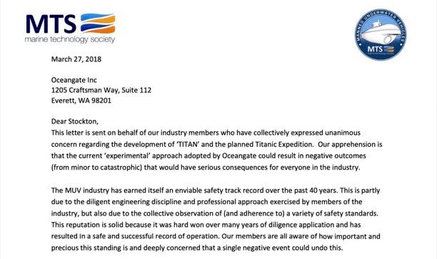 On March 27th, 2018, OceanGate received a letter from the Marine Technology Society (MTS). The letter read “Dear Stockton, The letter is sent on behalf of our industry members who have collectively expressed unanimous concern regarding the development of ‘TITAN’ and the planned Titanic Expedition. Our apprehension is that the current ‘experimental’ approach adopted by Oceangate could result in negative outcomes (from minor to catastrophic) that would have serious consequences for everyone in the industry”