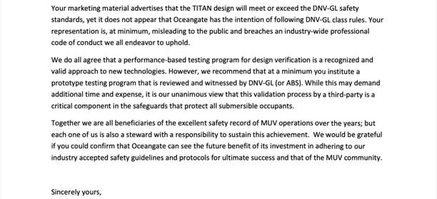 On March 27th, 2018, OceanGate received a letter from the Marine Technology Society (MTS). The letter read “Dear Stockton, The letter is sent on behalf of our industry members who have collectively expressed unanimous concern regarding the development of ‘TITAN’ and the planned Titanic Expedition. Our apprehension is that the current ‘experimental’ approach adopted by Oceangate could result in negative outcomes (from minor to catastrophic) that would have serious consequences for everyone in the industry”